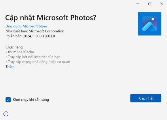 Tại hộp thoại hiện ra, bạn nhấn nút "Cập nhật" để tiến hành cài đặt phiên bản mới cho ứng dụng Photo trên Windows.