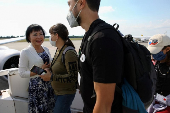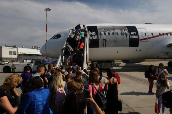 Bà Phan Thị Kim Phúc (em bé Napalm) và chiếc máy bay chở những người tị nạn từ Ukraine đến Canada ở sân bay Chopin ở Warsaw, Ba Lan hôm 4/7/2022