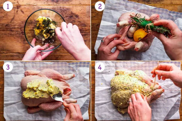 Dùng cọ phết bơ thảo mộc khắp bề mặt da gà. Khi khắp con gà được phủ bơ chanh thảo mộc thì kéo hai chân gà vào sát nhau và buộc chúng lại.