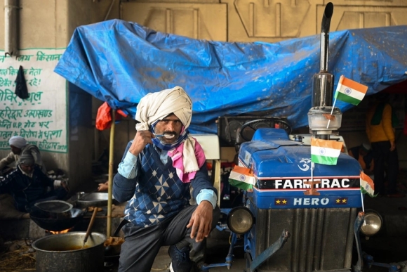 Một nông dân đánh răng trên một chiếc máy kéo tại khu vực giáp ranh Delhi Uttar Pradesh ở Ghazipur, Ấn Độ - Ảnh minh họa: AFP
