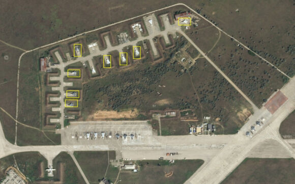 Căn cứ không quân Saki vài tiếng trước loạt vụ nổ bí hiểm. Máy bay vẫn còn nguyên vẹn với ánh bạc thấy rõ. Ảnh: Planet Labs.