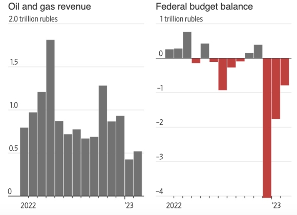 Với dòng chảy khí đốt Nga cung cấp cho châu Âu đã giảm xuống mức tối thiểu và châu Âu áp lệnh cấm vận lên dầu thô và các sản phẩm dầu tinh luyện của Nga, thu ngân sách từ xuất khẩu năng lượng của Chính phủ Nga đã giảm gần một nửa trong 2 tháng đầu năm nay so với cùng kỳ năm ngoái. Cùng với đó, thâm hụt ngân sách tăng lên mức 34 tỷ USD trong 2 tháng đầu năm, tương đương 1,5% GDP. Điều này buộc Moscow phải rút tiền từ quỹ lợi ích quốc gia - một trong những dự trữ chính cho trường hợp khủng hoảng.