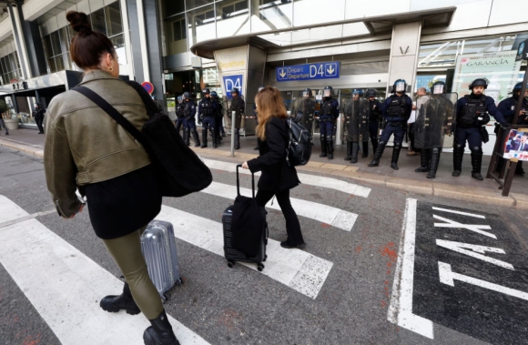 Hành khách kéo hành lý đi bộ qua nhà ga số 1 tại sân bay Nice, Pháp trong bối cảnh cảnh sát chống bạo động đứng xung quanh ngày 23/3. Ảnh: Reuters