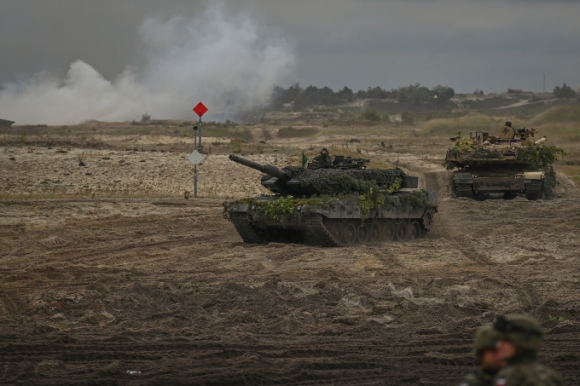 Quân đội Ba Lan sử dụng xe tăng Leopard do Đức sản xuất tại bãi huấn luyện ở Nowa Deba, tỉnh Subcarpathian, hồi tháng 9 năm ngoái. Ảnh: AFP.