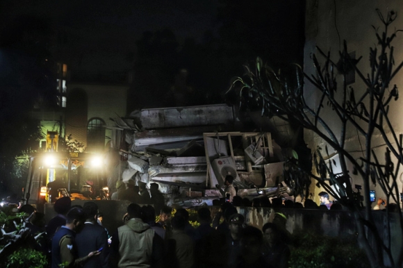 Tòa chung cư ở thành phố Lucknow, Ấn Độ, bị sập nghi do ảnh hưởng bởi động đất - Ảnh: AFP