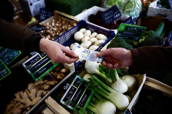 Một người mua hàng thanh toán bằng tờ tiền 20 euro tại một khu chợ địa phương ở Nantes, Pháp, ngày 1 tháng 2 năm 2024. REUTERS/Stephane Mahe